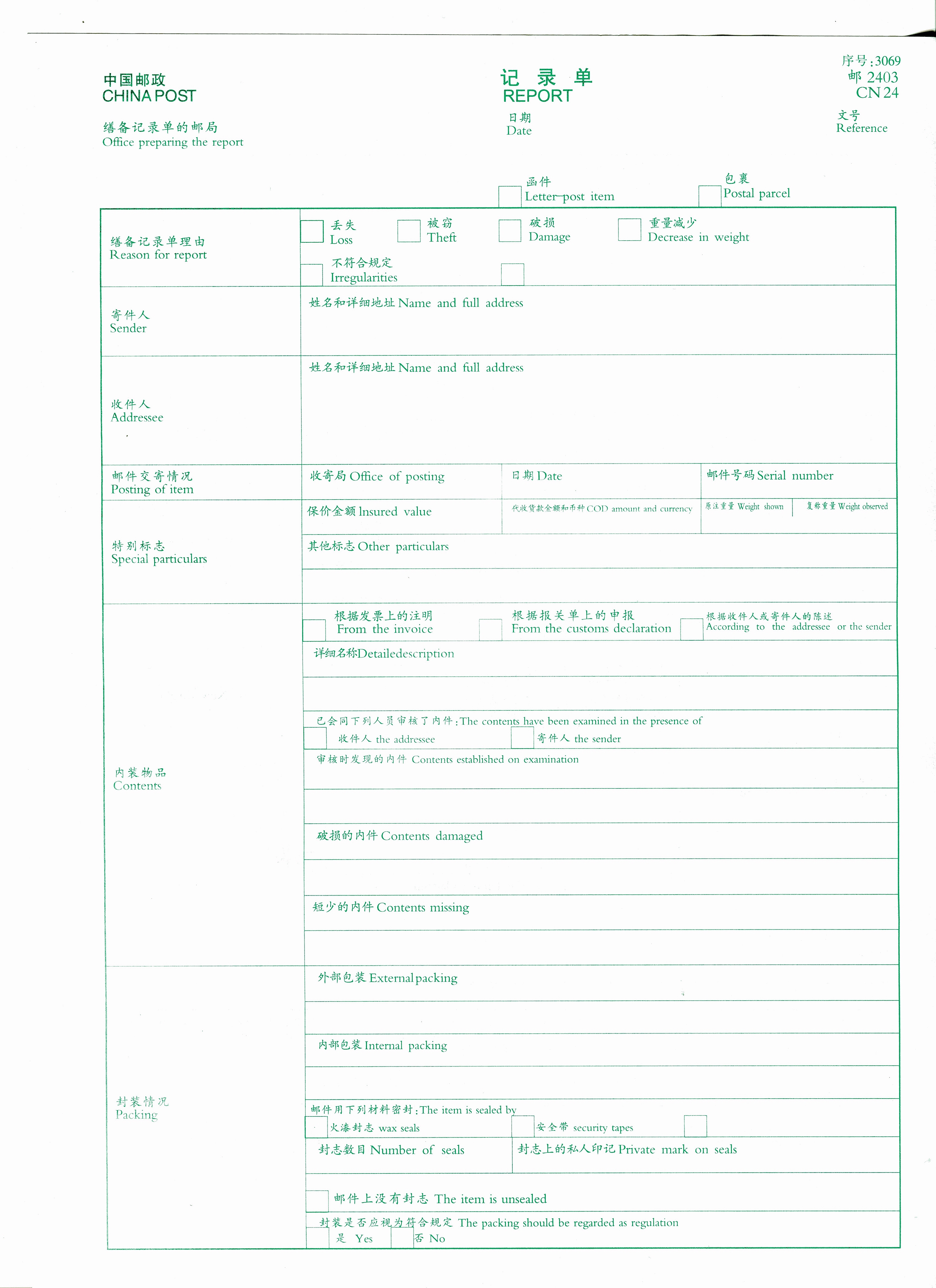 1.中國郵政開據的商品破損證明報告(CN24報告)點擊確認樣式,缺失物品需要在報告中寫明。就算是外包裝完整,請也務必讓郵局開具外包裝完整,內部缺件證明。